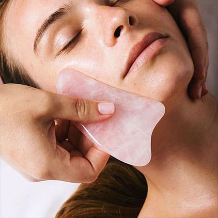 - Kasvot hierotaan jäähdytetyillä Gua Sha -kivillä.